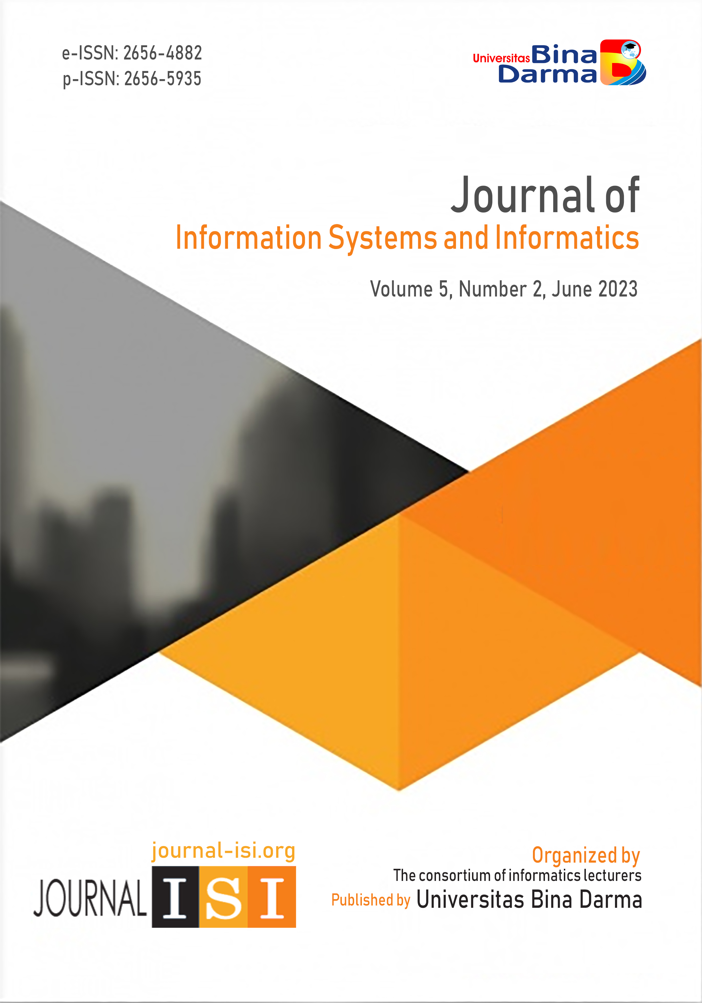 Journal of Information Systems and Informatics (Journal-ISI) Volume 5 Number 2 June 2023 Published 25 articles, there are 56 Authors, 21 affiliations from 7 countries (Indonesia, South Africa, Mauritius, Namibia, Nigeria, Malaysia, and Burkina Faso) as follows: